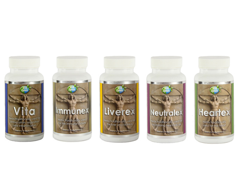 El régimen integral de desintoxicación consta de cinco hierbas de VitaZymes, combinaciones: Vita, Neutralex, Liverex, Immunex y Heartex, que son complementos perfectos para la desintoxicación, así como crear un sistema inmunológico y cardiovascular fuerte y saludable, ayuda recuperarse y mantener buena salud global.